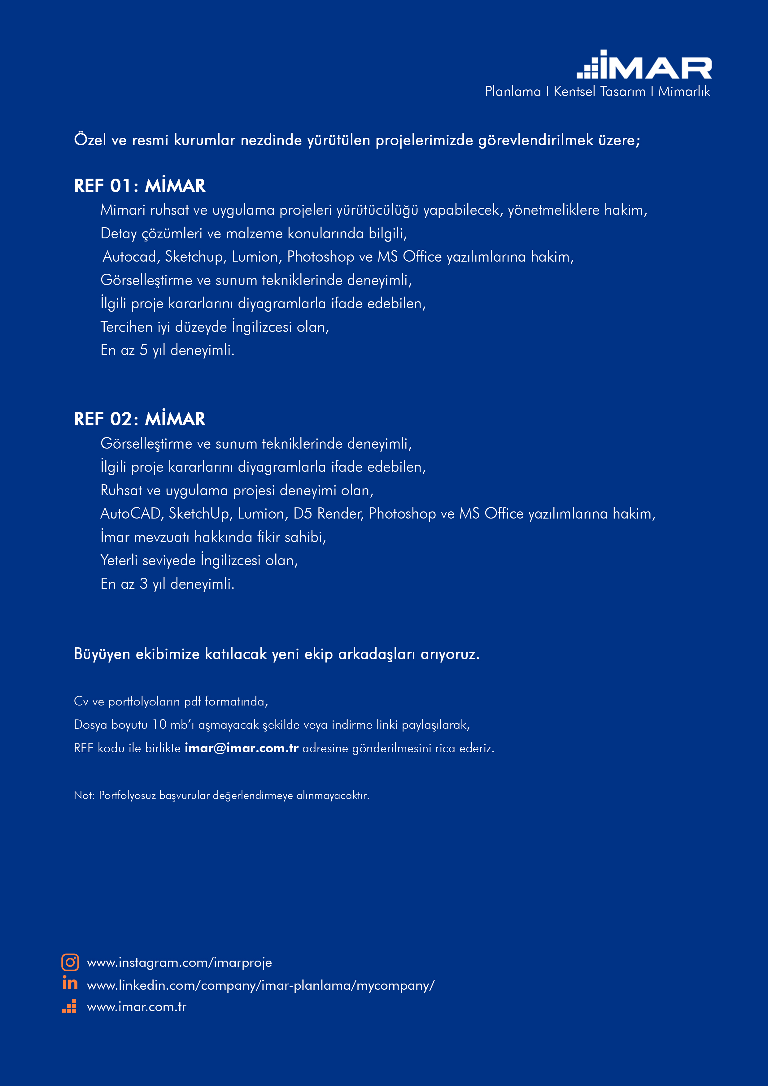 Kurucu ortaklar, İstanbul Teknik Üniversitesi Şehir ve Bölge Planlama bölümünden 1997 yılında Şehir Plancısı olarak mezun olmuşlardır. İMAR, dinamik kadrosuyla stratejik düşünce ve yaratıcılığını her ölçekteki tasarıma aktarıp insanları doğayla buluşturmayı ve çevresel / sosyal kaliteyi yükseltmeyi amaçlamaktadır.